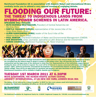 FLOODING OUR FUTURE SPEAKERS EVENT, TUESDAY MARCH 1 - Rainforest ...17 Feb 2011... hydroelectric dams gets underway in the Amazon Basin, three impassioned indigenous leaders are travelling from their homelands to London ...